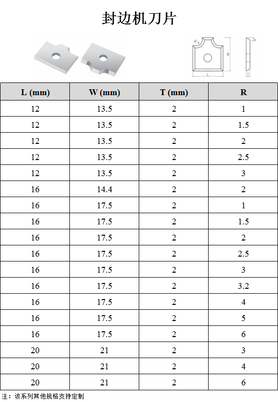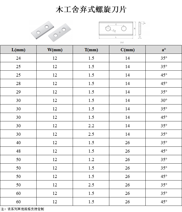 舍棄式硬質(zhì)合金刀片,又稱木工刀片、硬質(zhì)合金刀片、壓刨刀軸刀片、雙面刨刀軸刀片、刨砂機刀片。其配套螺旋刀頭,刀軸,用于木工雙面刨機、四面刨立軸機、仿形機等機械機床分割各種軟硬實木刨花板密度板亞克力板等多種板材。